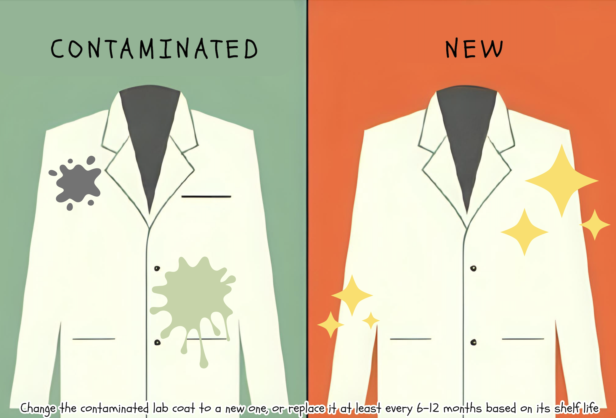 สวมให้พอดีตัว ไม่หลวมจนแขนเสื้อไปเกี่ยวกับอุปกรณ์อื่นๆและก่อให้เกิดอันตราย ควรติดกระดุมหรือเครื่องเกาะเกี่ยวให้ครบทุกเม็ด เพื่อป้องกันเสื้อผ้าเปิดและสัมผัสกับผิวหนัง และที่สำคัญห้ามใส่ออกนอกห้องแล็บ เช่น ไปคาเฟ่หรือห้องประชุม เพราะอาจพาเชื้อหรือสารออกไปสู่พื้นที่อื่น